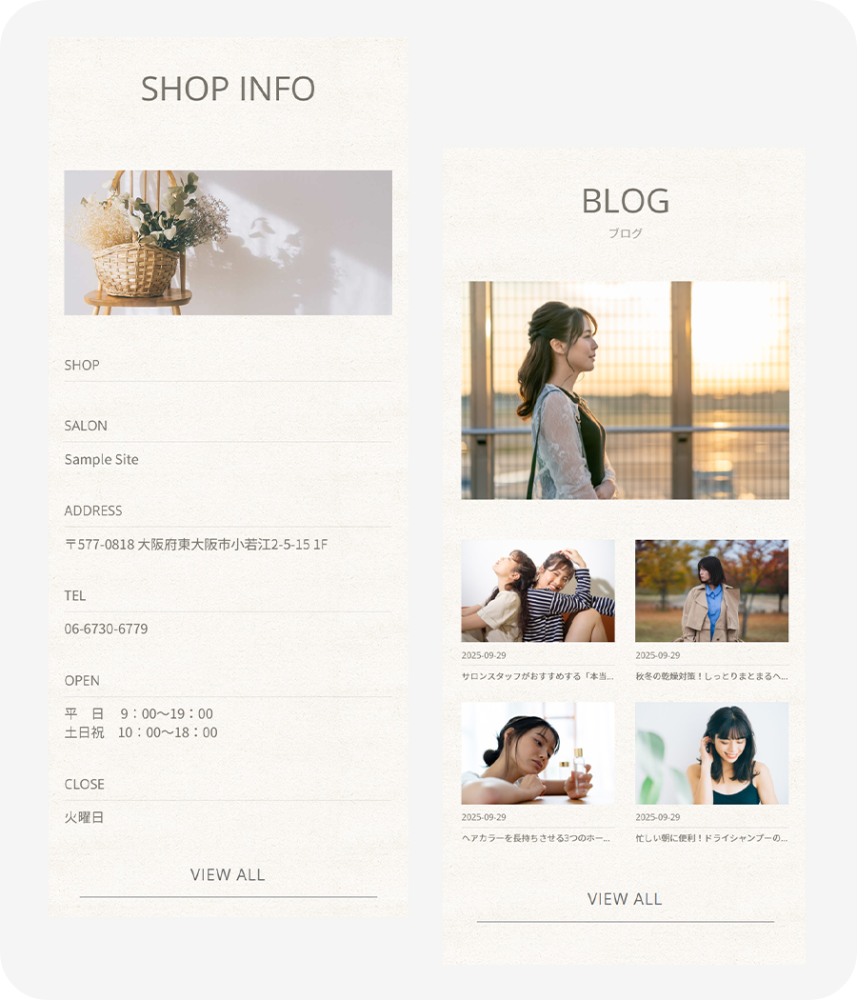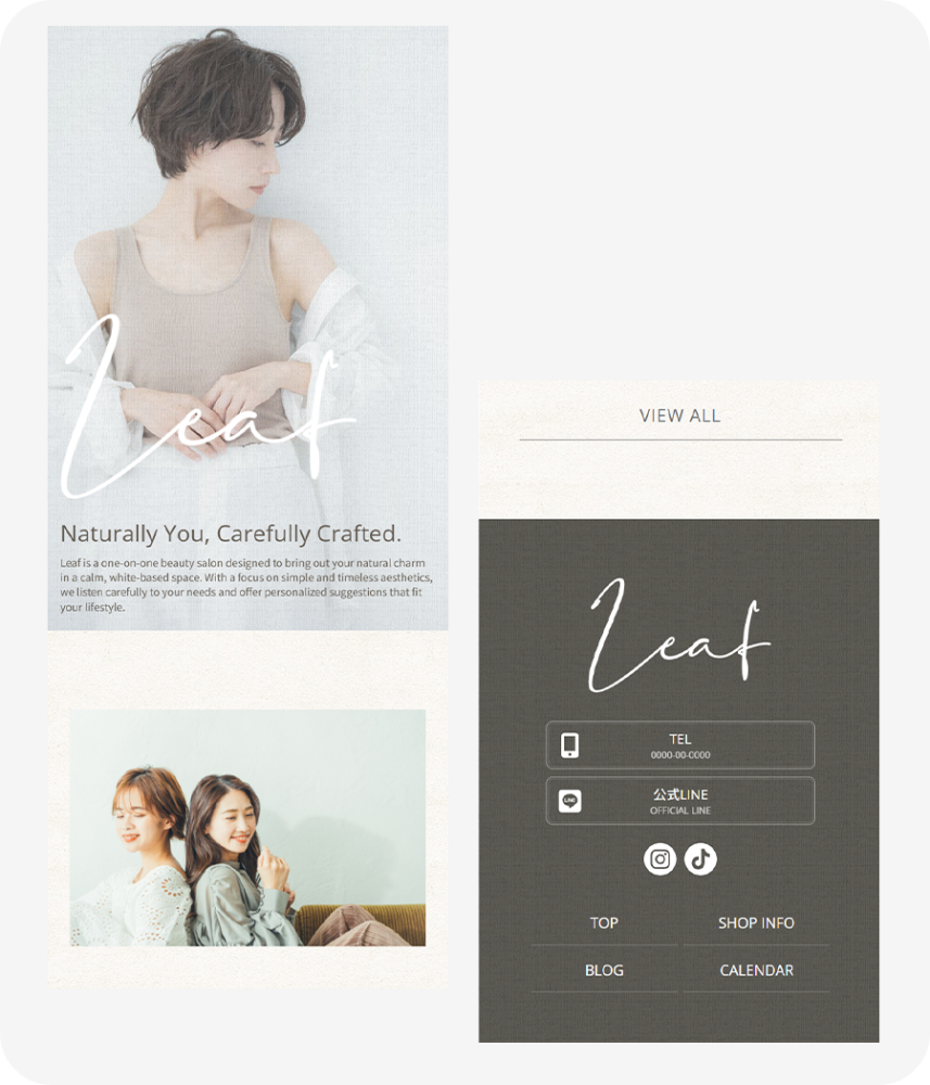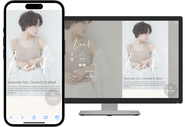 やわらかな光とリネン調のテクスチャをいかした、抜け感のあるナチュラルデザインです。「落ち着いた雰囲気のサロン・柔らかいイメージ」のホームページにしたい方にぴったりのデザインです。
