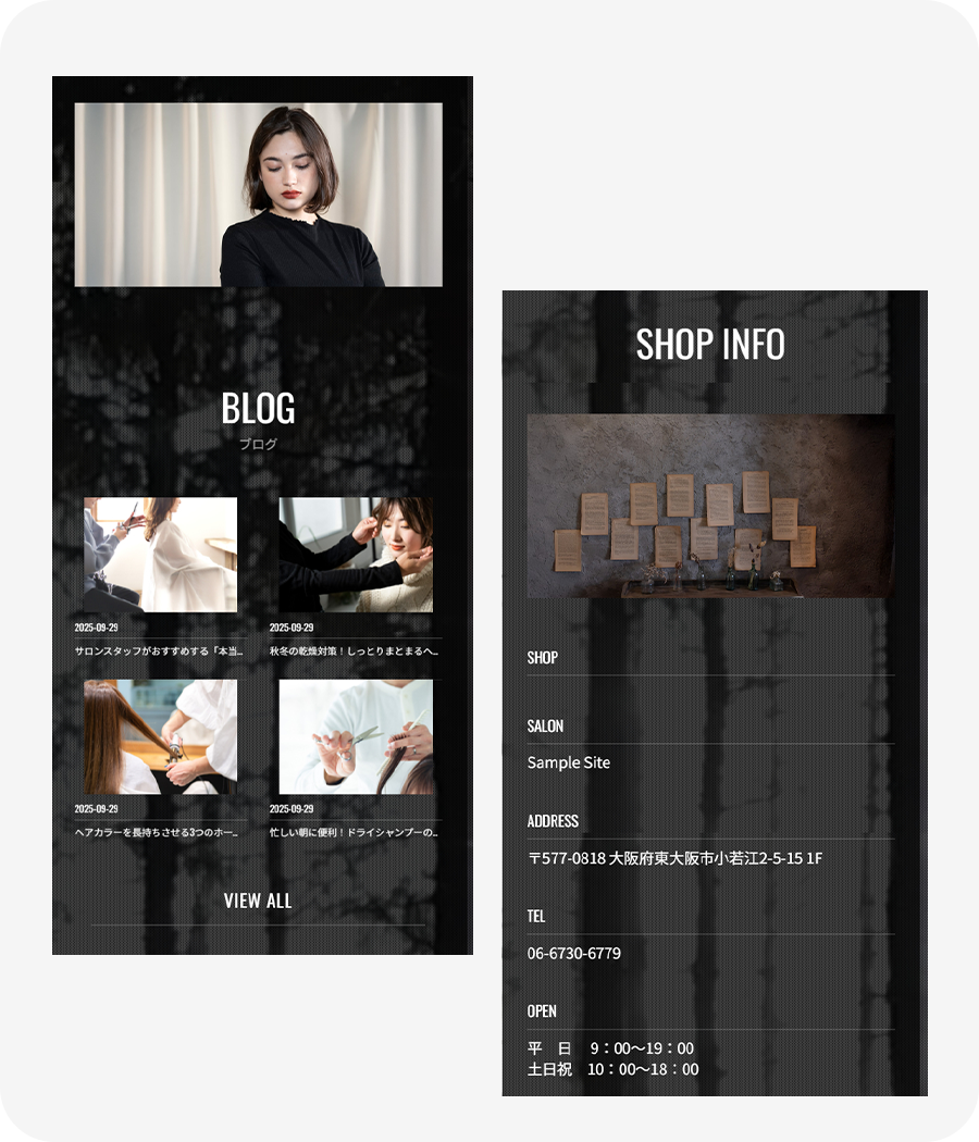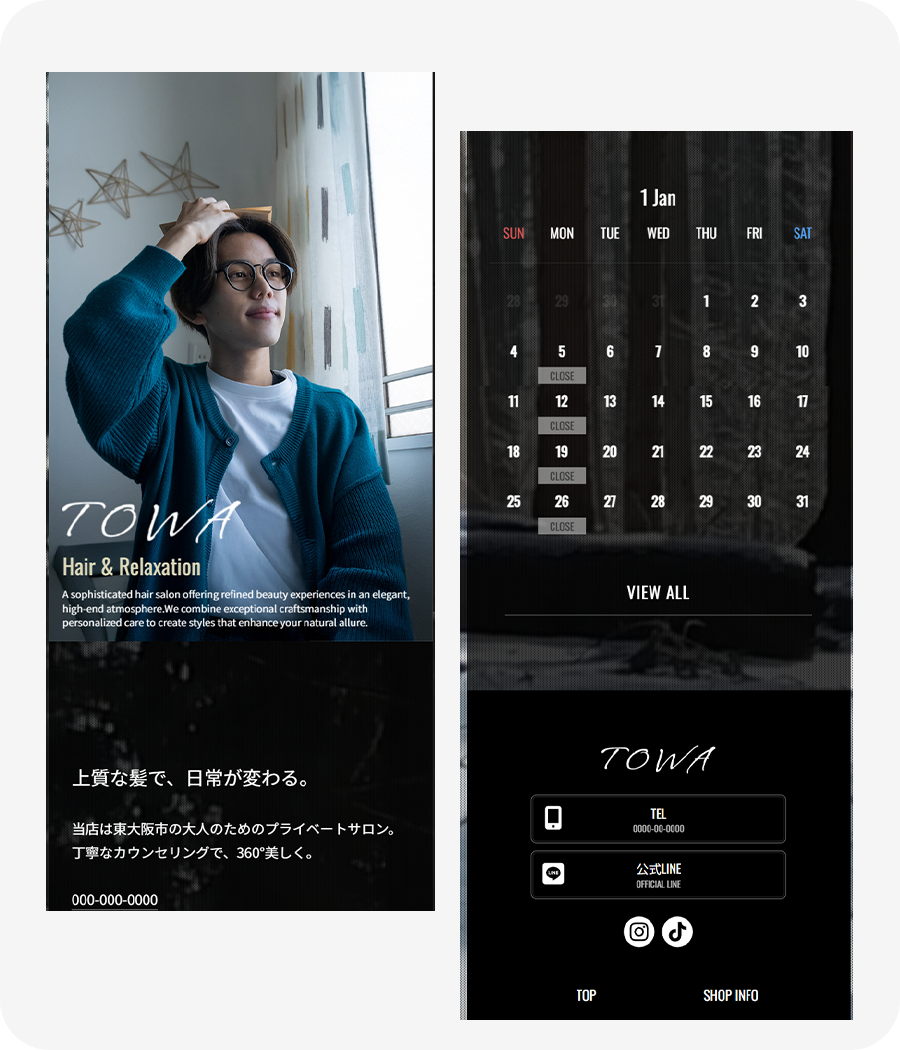 静かな森の風景とモノトーン寄りのスタイル写真を組み合わせた、凛とした空気感のあるデザインです。余白をいかしたレイアウトと手書き風ロゴが、上質さと抜け感を両立してくれます。大人の女性向けサロンや、洗練された世界観を大切にしているお店など、落ち着きの中に芯のあるかっこよさを表現したい方にぴったりのデザインです。