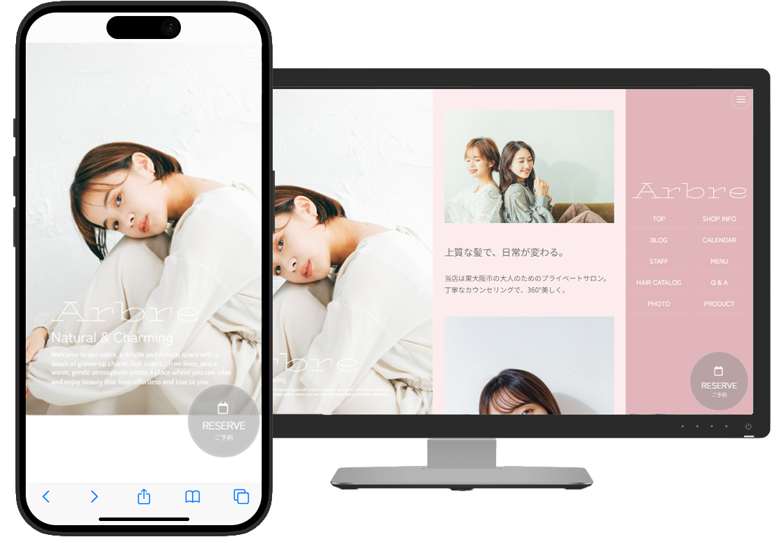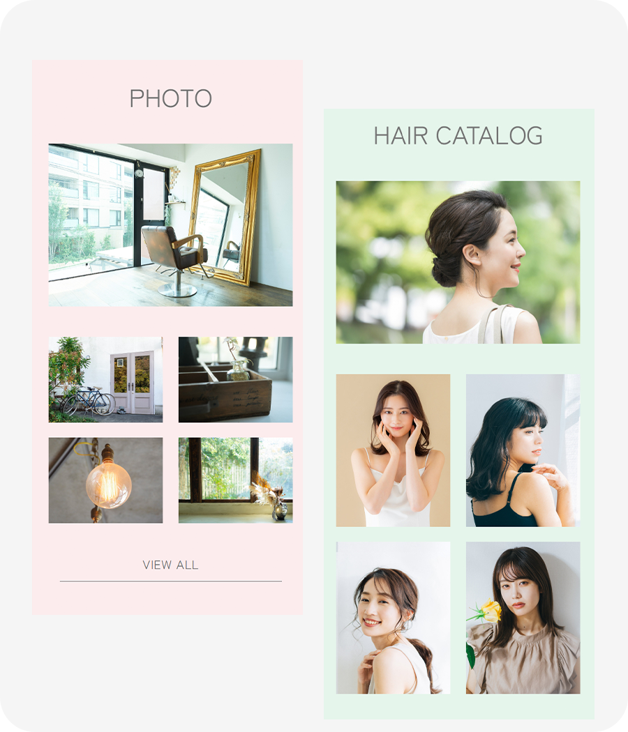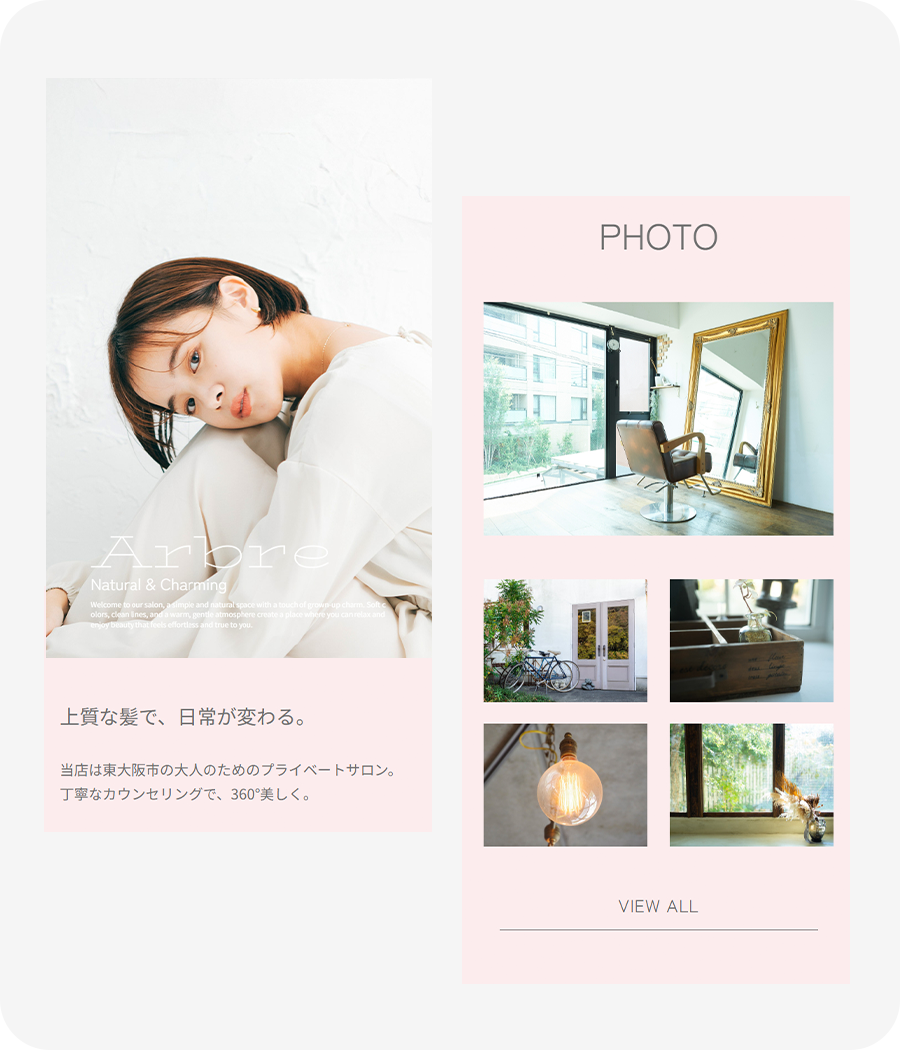 淡いピンクを基調にしたパステルトーンで統一した、やさしく上品な印象のデザインです。余白を広めに取り、写真とテキストの距離感をしっかり確保することで抜け感を演出。主張しすぎず上品にも見えるデザインです。